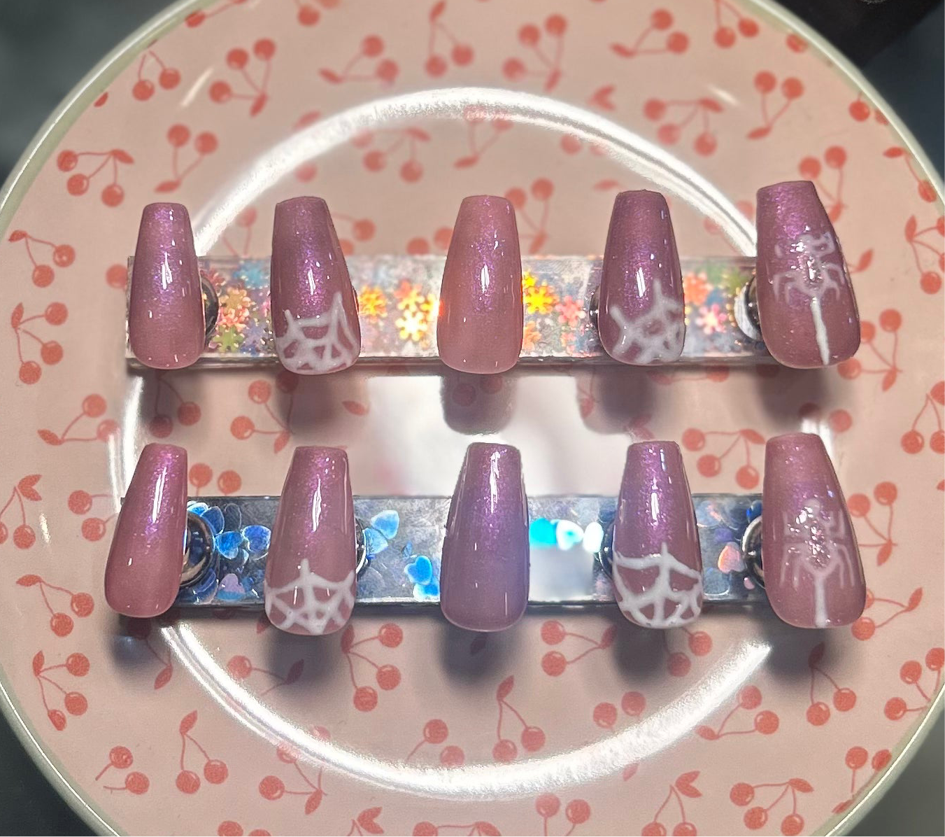 Step into the moonlit garden where fairytales meet a touch of darkness. Enchanted Webs is a mystical nail set featuring deep mauve shimmer, delicate white cobwebs, and tiny spider accents. Perfect for those who love a mix of gothic elegance and fairy magic.