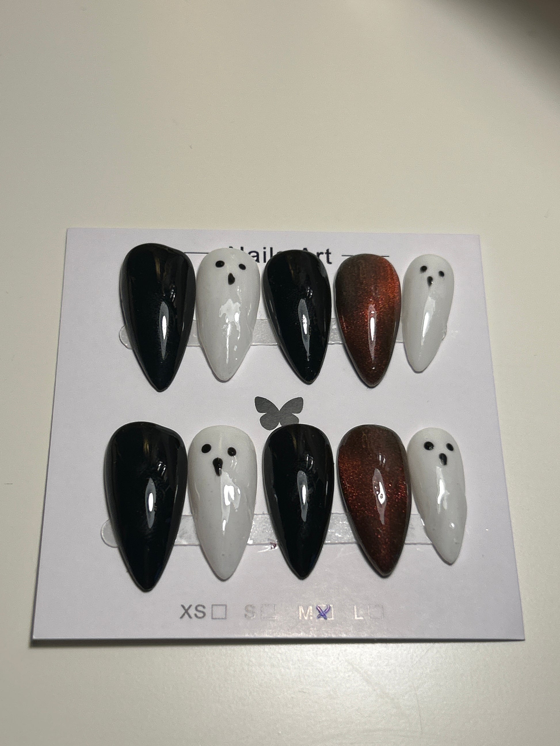 Step into the spooky season with Midnight Ghosts, a hauntingly chic press-on nail set. Featuring hand-painted ghost designs on a striking mix of deep black, shimmering brown, and crisp white, this set blends eerie vibes with effortless glamour. Perfect for Halloween parties, cozy autumn nights, or anyone who loves a touch of the supernatural in their style. 🎃