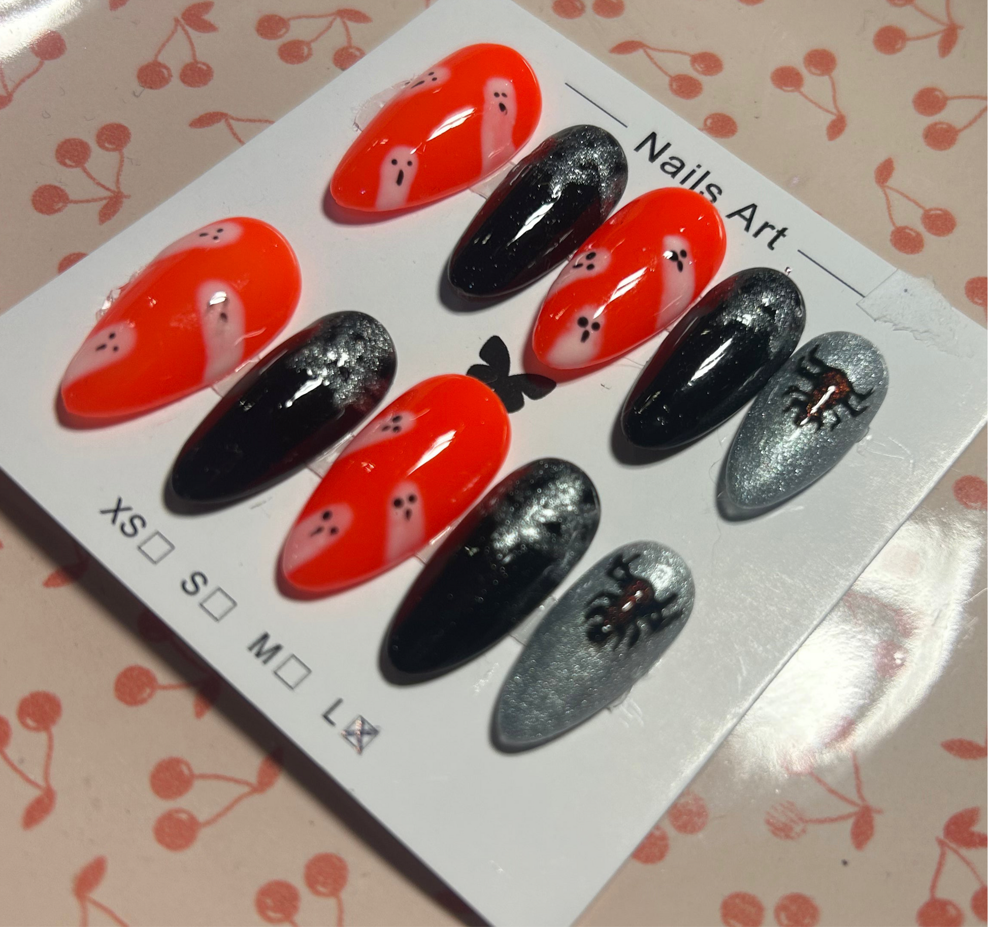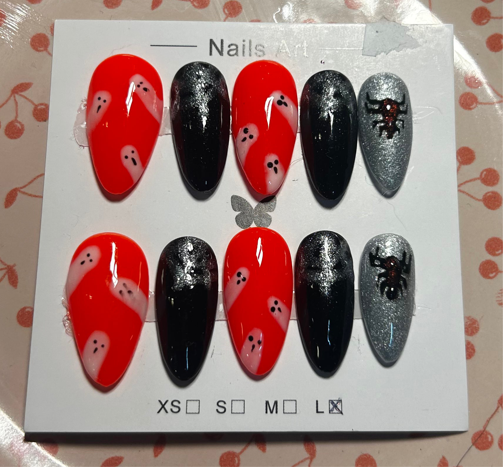 Get into the Halloween spirit with this playful yet stylish press-on nail set! Featuring bright red and jet-black tones with shimmering silver accents, these nails are decorated with adorable little ghosts, sparkly cobwebs, and a spooky-cute spider friend. Perfect for October vibes, costume parties, or anyone who loves a touch of fright with their fashion.