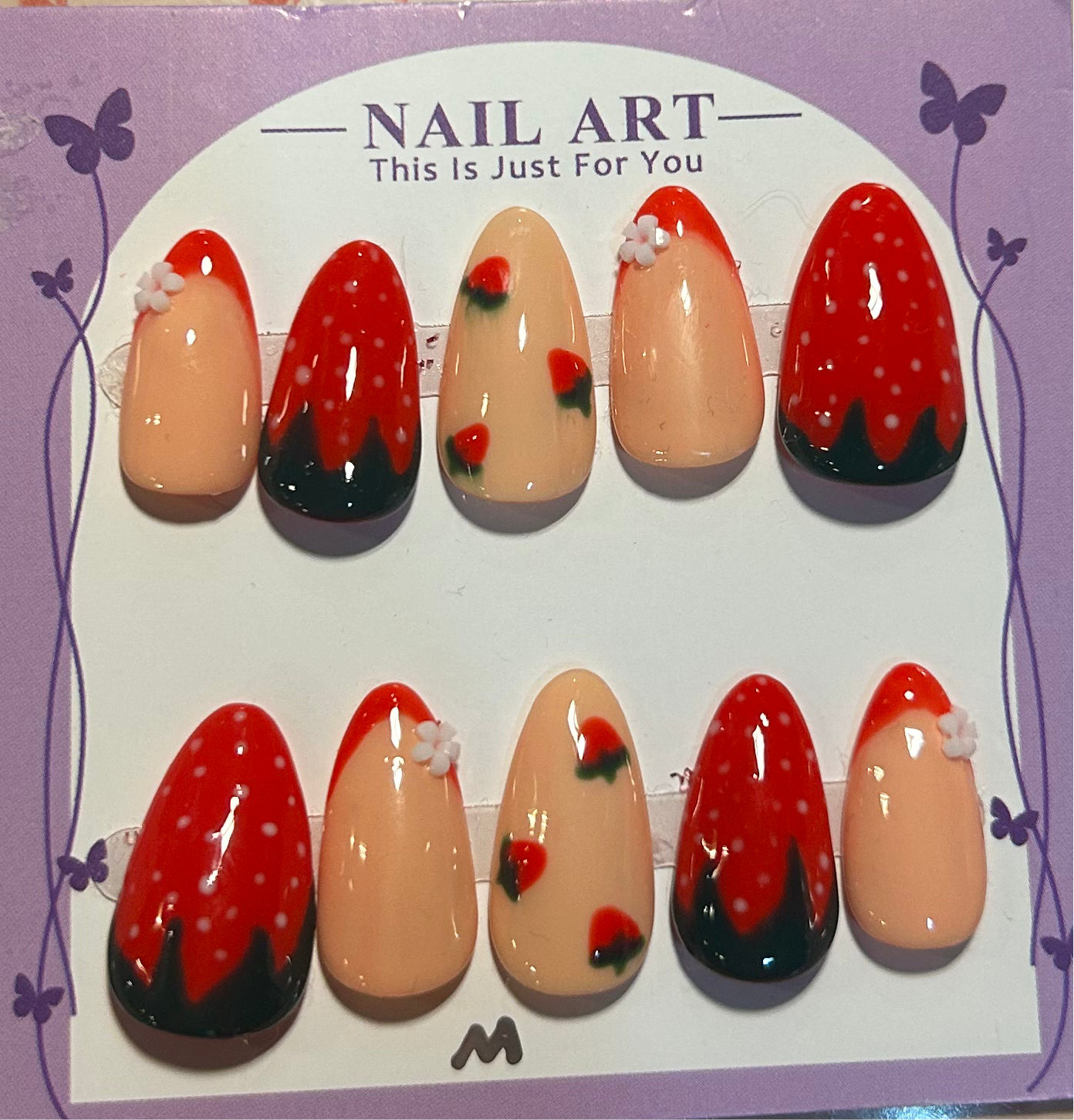 Sweet, fresh, and full of charm — this set is inspired by the juiciest summer strawberries. Featuring a mix of bold red strawberry tips, delicate floral accents, and soft nude tones, these nails strike the perfect balance between playful and elegant. Tiny painted details and glossy finishes make each nail look like a dreamy little berry patch at your fingertips.
